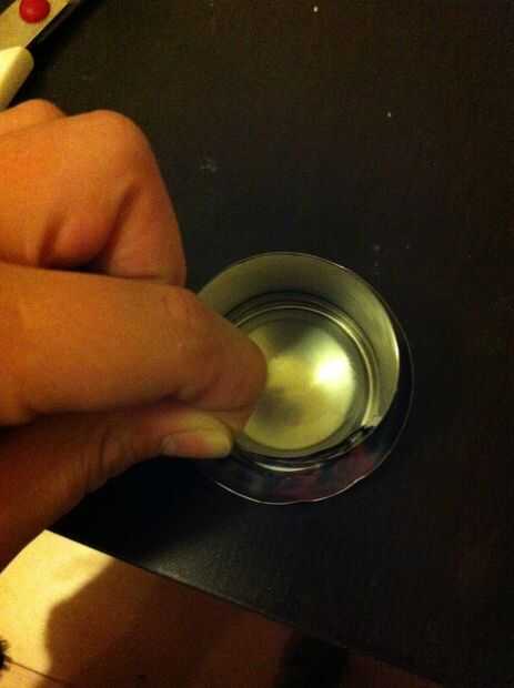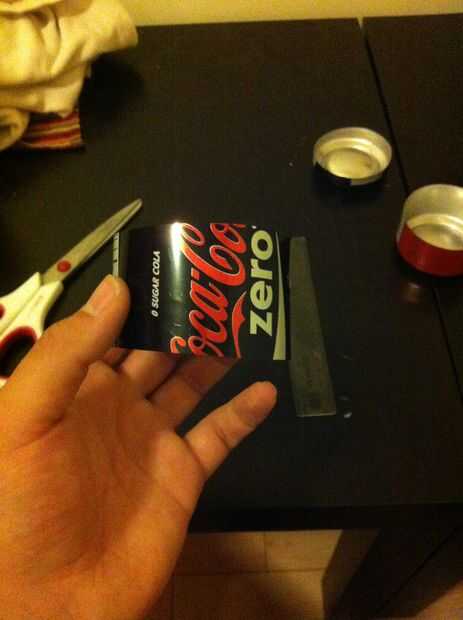 Ahora uso ese pedazo de metal que es el centro de la lata y cortar una tira de 4 cm de ella. Asegúrate de que encaje bien en el pequeña corte de la lata. Sostenga los 2 extremos y marque una línea a cada lado. Luego cortar a mitad de camino y bloquear ambos extremos juntos.