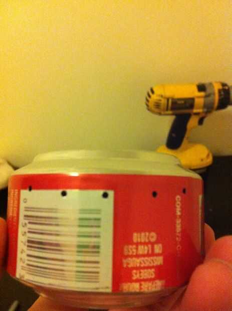 Tome el taladro y broca de 1/16 y perforaciones 16 chorro espaciados uniformemente en la parte exterior de la can. No empuje tan duro que cuando taladre a través de pinchazos la tira poco.