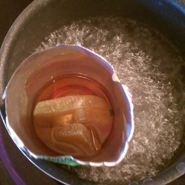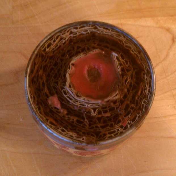 A continuación, derretir la cera y viértalo lentamente en las grietas de la cartulina asegurando que tiene como poco aire como sea posible. El objetivo es permitir la cartulina quemar lentamente. En definitiva, están creando una vela con una gran superficie. El redondo es lo que voy a usar para iluminar una calabaza!