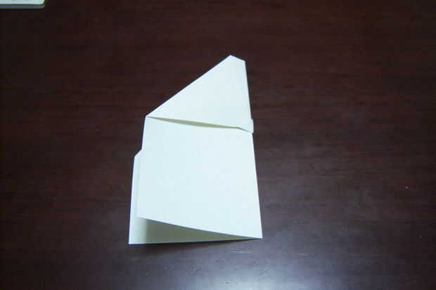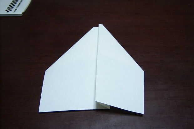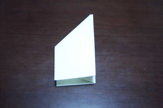 Doblar la primera ala abajo [Fig. 2]. Debe ser ligeramente en ángulo de la quilla del cuerpo plano (la parte formada por el pliegue de la referencia), estrechándose hacia la parte delantera del avión. Una buena regla general es que la quilla debe ser un cuarto de pulgada de alto en la nariz del snub y 3/4 de una pulgada en la cola. Lo se esto suena confuso, basta con mirar el pliegue marcado en rojo en la foto. 3 y esperemos que lo que quiero decir será clara [Fig. 3].