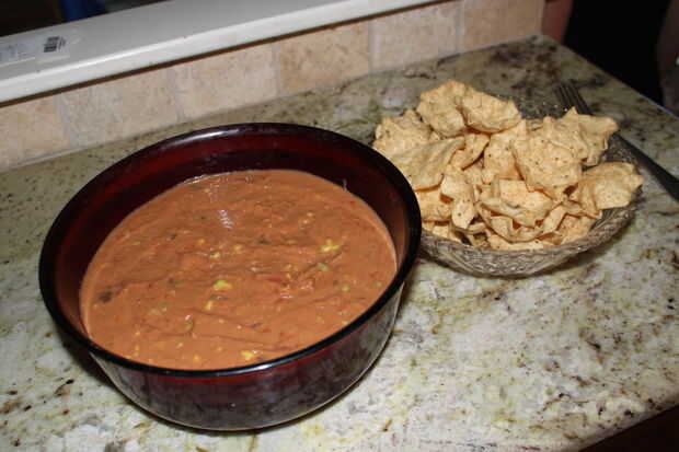 Antes de quedarse conmigo, había estado viajando norte desde Florida hasta Maine en un 94 Benz llevando consigo el Evangelio buena de salsa de frijol.  Este es el mejor chip dip scoop/topping/salsa/etcétera.  Construido sobre una base de frijoles refritos y salsa, se convierte en una explosión de sabor en la boca con sutilezas ocultas como aguacate y jugo de limón.