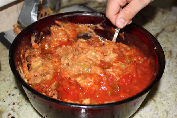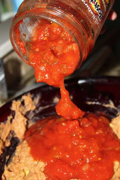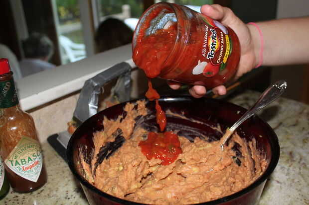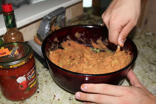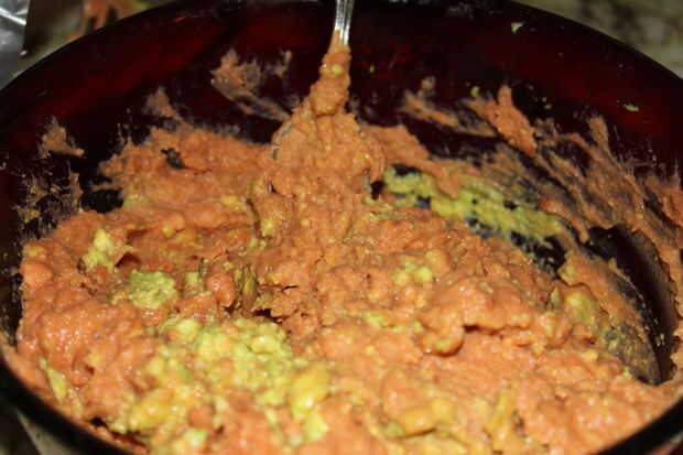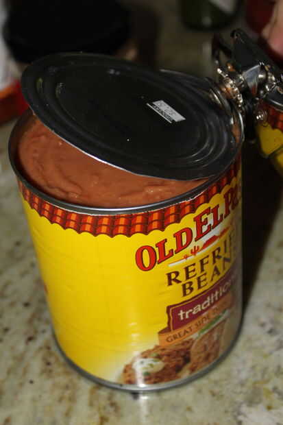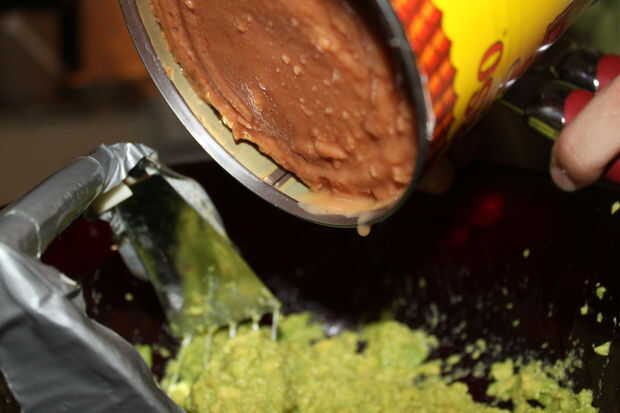 a continuación, abrir una lata de frijoles refritos y plop en el tazón de fuente sobre el aguacate. Si resisten que sale de la can, uso el abrelatas para poner un pequeño orificio de aire en la parte inferior y deben precipitarse fácilmente hacia fuera. (Si no salen fácilmente, abrir el fondo de la lata y empuje hacia fuera). Mezclar con un tenedor.