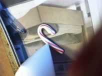 3. a efectos de estética añadí bastones de caramelo alrededor de la puerta. Tubo una línea de formación de hielo real a lo largo de la caña de azúcar y mantenga a la casa de pan de jengibre durante unos minutos asegurar la seguridad