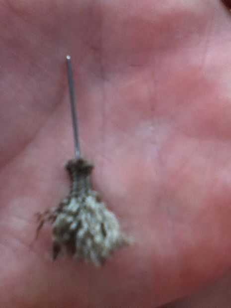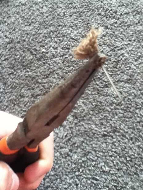 Coloque un alfiler a través del extremo deshilachado y salga por el extremo enteras para el perno sobresalga unos 2cm.