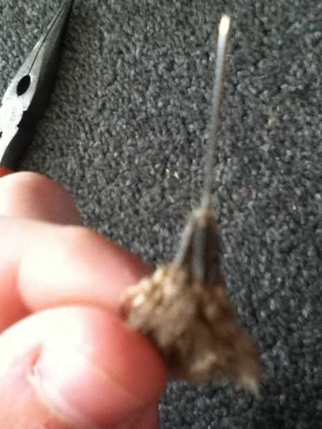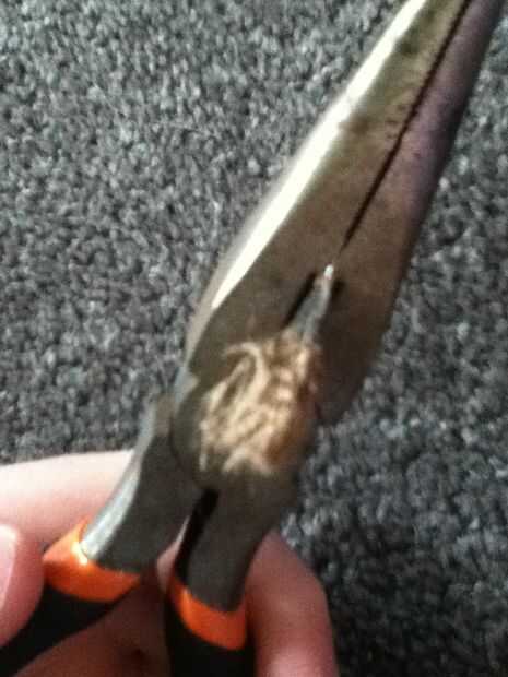 Tomar las pinzas o un par de cortadores laterales y cortar el los lados del pegado final del dardo que se forma como un triángulo no es un cuadrado.