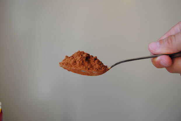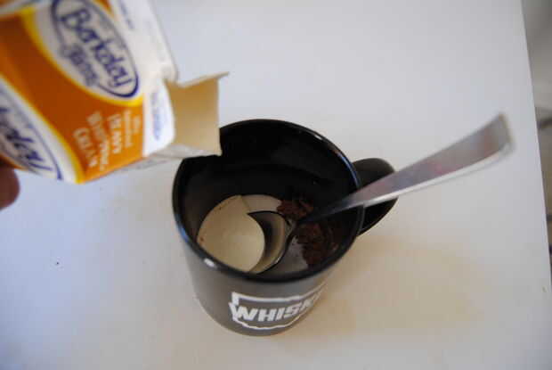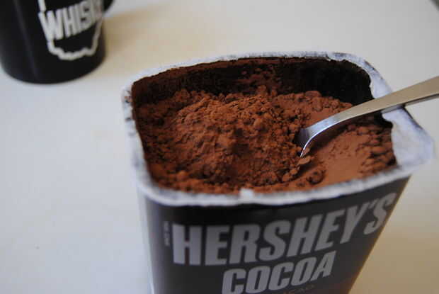 Comience agregando los ingredientes secos. Añadir dos cucharadas de cacao en polvo y azúcar cada una (ver fotos arriba). Incorporar bien porque mezcla óptima se requiere.