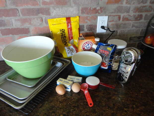 Los tazones de fuente, mezclador, medir tazas y cucharas, las manos, horno, galletas...