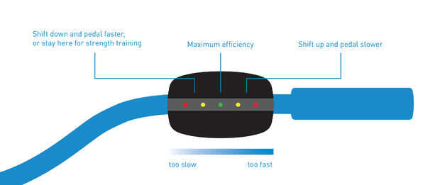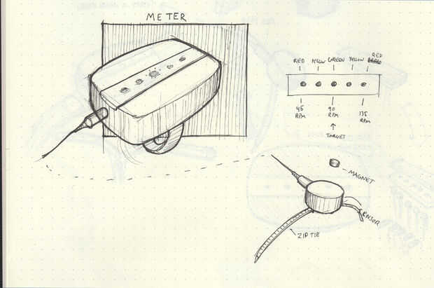 Decidí hacer un metro con ningunos números en todos. En cambio, opté por usar LEDs. El LED verde en el medio representa el rango objetivo ideal: 85-95 rpm. A ambos lados son amarillo y el LED rojo, lo que significa la cadencia es demasiado alta o demasiado baja. Pensé que esto me dejaría una ojeada rápidamente mientras yo estaba montando y ajustar sin tener que pensar demasiado.