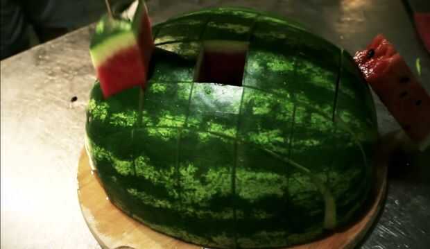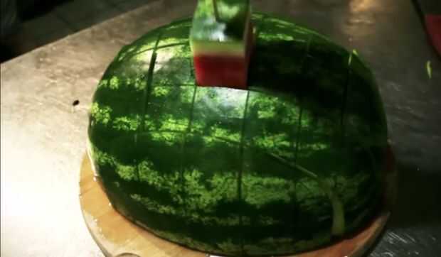 Ahora sólo se utiliza un mondadientes o palillo largo para extraer el trozo de sandía, este truco deja su mano limpia... y puedes compartir tu sandía con un montón de amigos!