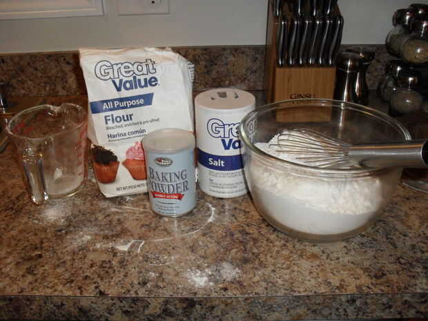 Primero debes batir 6 tazas de harina con 2 cucharadas de polvo para hornear y 1 cucharadita de sal.