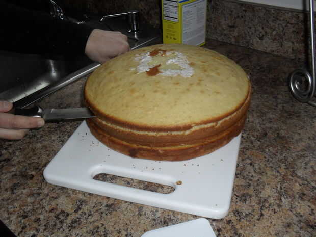 Una vez que las tortas son completamente frío ahora está listos para preparar a las heladas les.  Cortar la parte superior de la inferior a capas y me dejó la ronda dos más pequeños.  Una de las tortas más pequeño será para la capa superior y el otro se utilizará más tarde para el pastel de cumpleaños.  Que se separa el glaseado es muy fácil utiliza una cuchilla de corte de masa y un cuchillo, pero era un poco lento para mí porque quería intentar hacer todo incluso y perfecto.  Para los primeros he trazado un símbolo circular en vez de las tortas más pequeñas y luego recortar.  Una vez que se corte el pastel de cumpleaños puse mi color naranja glaseado en y poner dos brochetas en el sombrero para que se mantenga robusto y manténgalo en la parte superior del pastel.