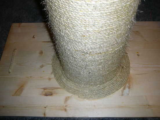 aprender a construir un simple gato rasguño post usando cierta cuerda de sisal, un 4 x 4, planchas de madera y un pedazo de estera de la parada del caballo (o alfombra).