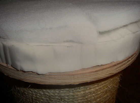 Poner la guata encima de la espuma. (Estaba usando los restos, por lo que es en dos piezas. Usted puede pedazo lo juntos o simplemente cortar un gran círculo. La cubierta sujetarlo todo, pase lo que pase.)