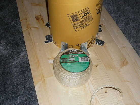 aprender a construir un simple gato rasguño post usando cierta cuerda de sisal, un 4 x 4, planchas de madera y un pedazo de estera de la parada del caballo (o alfombra).