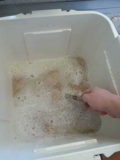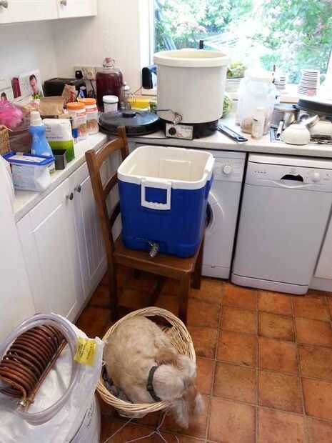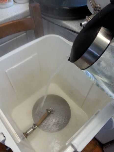 OK para preparar la Cuba de puré, vierta un par de backups completos de caldera de agua hirviendo. Esto es para calentar todo el asunto de lo contrario perderemos mucho calor cuando se agregan los granos y el agua caliente.