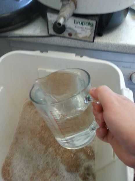 Una vez caliente, mida los granos y viértalos en el tun. Por último agrego 2 cucharadas de DLS. Este es un material polvoriento blanco (saltar si no se realiza ningún tratamiento de agua). Ahora agregamos la cantidad correcta de agua para los cereales. La proporción de agua a la fibra es aproximadamente 1.5lt por libra, lo que significa que necesitamos 12lt * de agua para nuestro 8 lb de grano (perdón por la mezcla de medidas Imperiales y métricas!). Esto es importante como demasiado y el puré será delgada y demasiado caliente y demasiado poco y el puré será grueso y demasiado frío. Purés finos va no eficientemente a convertir los azúcares fermentables. Un puré grueso, frío convertirá muy eficiente y su azúcar se fermenta a una cerveza de alta graduación muy seco. Queremos que en algún lugar en el medio, una buena mezcla de azúcares fermentables y no fermentables para dar el equilibrio justo de dulce a amargo.