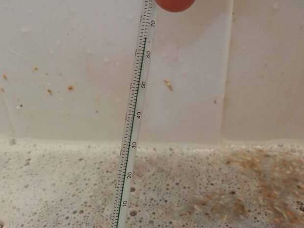 Usar una jarra medidora y eche en el grano. Una vez que toda el agua se agrega le doy un buen revuelo asegurándose de que romper cualquier bolsillos secos. Medir la temperatura es un perfecto C 65-66.