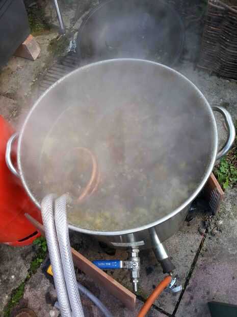 Yo uso una quema de gas normalmente se utiliza para techos, un quemador de alta potencia agradable. Todavía tarda unos 10-15min a hervir. Una vez que el puré esté hirviendo su tiempo a añadir nuestro primer salto además, 1oz de EGK.