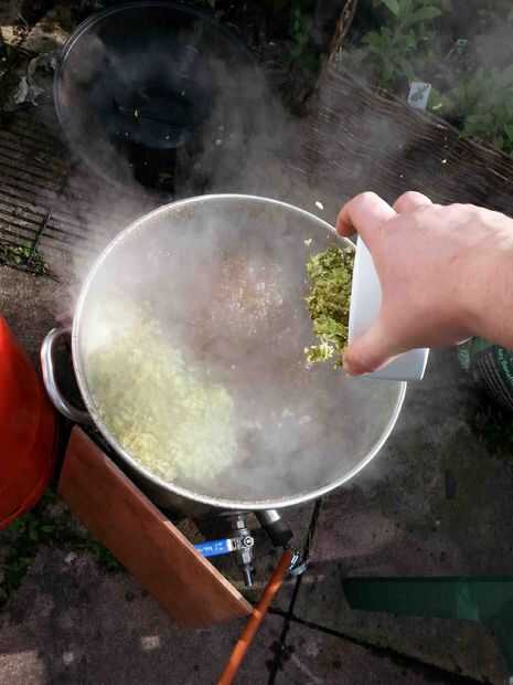 Después de 45 minutos es tiempo para la segunda además, 0.5oz EKG y 0.5oz Fuggles. También agregar una cucharadita de irish moss. Se trata de algas y ayuda a despejar la cerveza. También lanzo en mi bobina de enfriador de mosto. Una bobina de cobre grande. Después de hervir, el agua fría pasa a través de esta bobina y enfría el mosto a la temperatura ambiente en aproximadamente 30 minutos. Estos son realmente útiles, pero no es necesario y no he tenido problemas dejando el mosto fresco durante la noche. Pero es bueno tener.