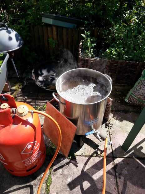 Después de 60min apagar el gas y volver a la cocina. Cuidado con 4 galones de hierba hirvienda! (1 galón perdió por evaporación).