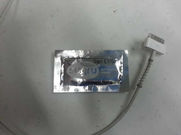 El plan era construir un mejor alivio de la tensión en el cable usando primero un resorte de un pasador de punto de bola y un paquete de Sugru.