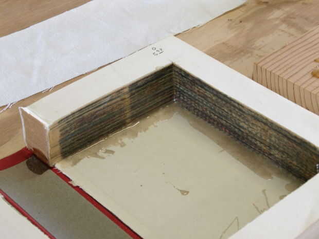 Pone el libro en su parte delantera de la cubierta para arriba. Nos mezcle una pequeña cantidad de epoxi y pintar el interior de la caja fuerte con el epoxi. Asegúrese de que conseguir algo bajo la sábana bajera para pegar el libro a la tapa trasera. Se puede utilizar pegamento super fino solo la driblar en toda la superficie de corte del libro. Esta maquina se sujetan las páginas y ayudar al libro para mantener su forma.