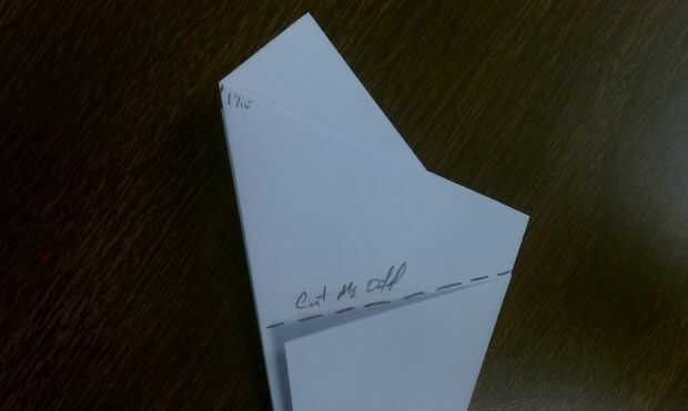 Lo primero que Te sugiero que hacer es cortar el papel sobrante que no se puede utilizar en su diseño. No tienes que, pero esto hará un poco más fácil. Desde nuestro último doblez voltee el papel horizontalmente. Verá una diagonal ejecución de borde a la derecha y hasta cerca de un tercio del camino desde la parte superior del papel. Corte todo por encima de él. (Ver foto)