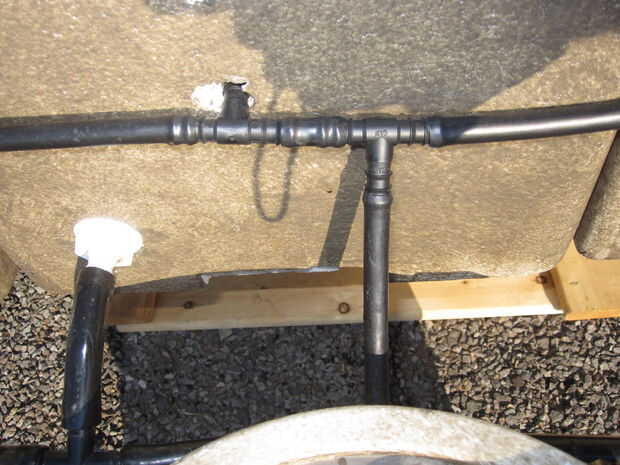 A continuación, coloque el cubo de embalse al lado del sistema de contenedores de espuma de poliestireno y corte de la principal línea de alimentación a la altura donde alinea con el tubo en el cuadro central. Instalar una t en el extremo de esta línea de alimentación.