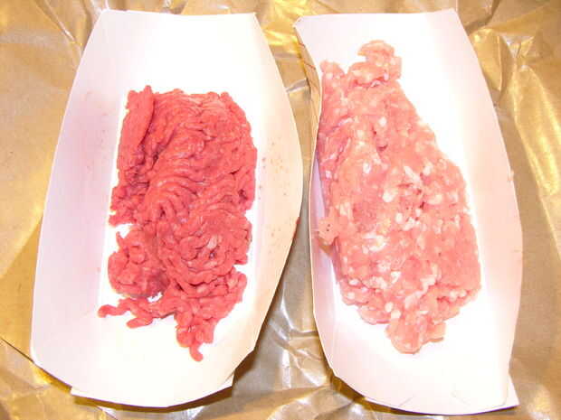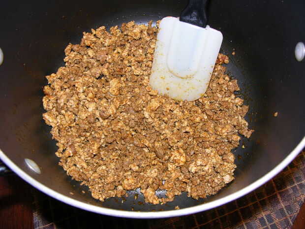 Poner el aceite restante en la sartén y freír la carne molida, revolver con frecuencia, hasta que cocinan y doran uniformemente. Condimentar con el pimentón, pimienta de Cayena, pimienta sal y negra o blanca a gusto. Dejar de lado que se enfríe.