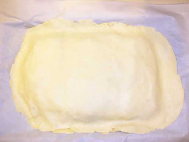 Suavemente y sin apretar el rectángulo alrededor del rodillo del rodillo y transferirlo a la bandeja para hornear preparada para la base de la pila.