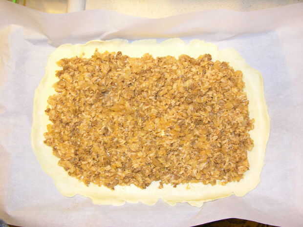 Suavemente y sin apretar el segundo rectángulo de masa en el rodillo del rodillo y colóquela cuidadosamente sobre el relleno como tapa de empanada.
