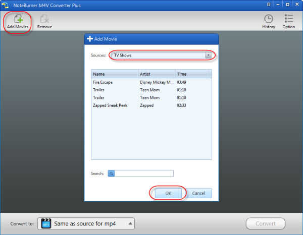 Lanzamiento NoteBurner M4V Converter Plus, haga clic en el botón Añadir películas, entonces usted verá el pop up de windows que le mostrará todas las compras de iTunes y alquiler. Este software de eliminación de DRM de iTunes le permite agregar su video de iTunes desde el catálogo de los medios necesarios tales como películas, programas de televisión, Podcasts, etc..