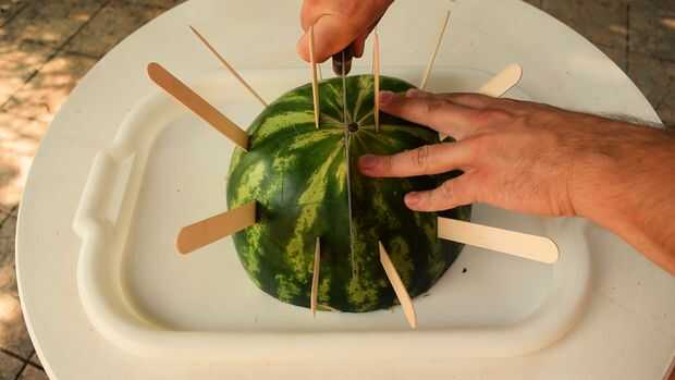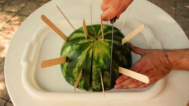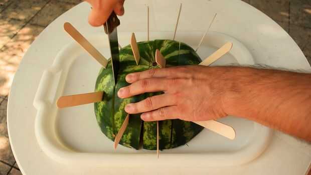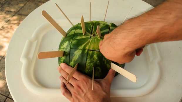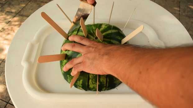 Tomar un cuchillo y cortar la sandía entre los palos. Siempre ten cuidado y mira tu mano!