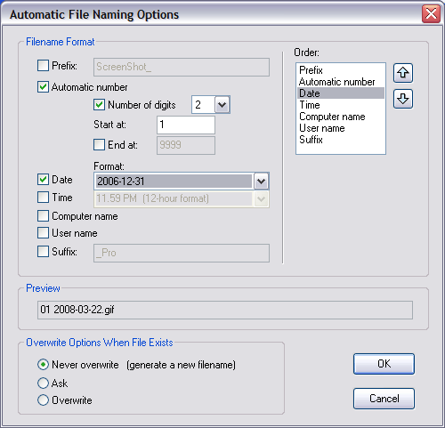 Haga clic en el botón al lado del botón de radio automático para configurar el esquema de nombre de archivo. Aquí usted puede Agregar un prefijo, un sufijo, fecha, tiempo, etc. al nombre del archivo. Golpe OK cuando listo.