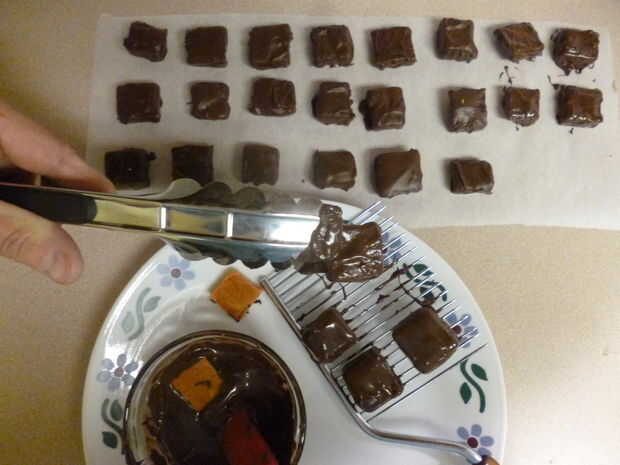 Con pinza o dos tenedores, sumergir las plazas en el chocolate derretido y permiten chocolate sobrante al desagüe antes de colocar la picadura en papel de pergamino. Permiten el chocolate se endurezca antes de retirar del papel pergamino.