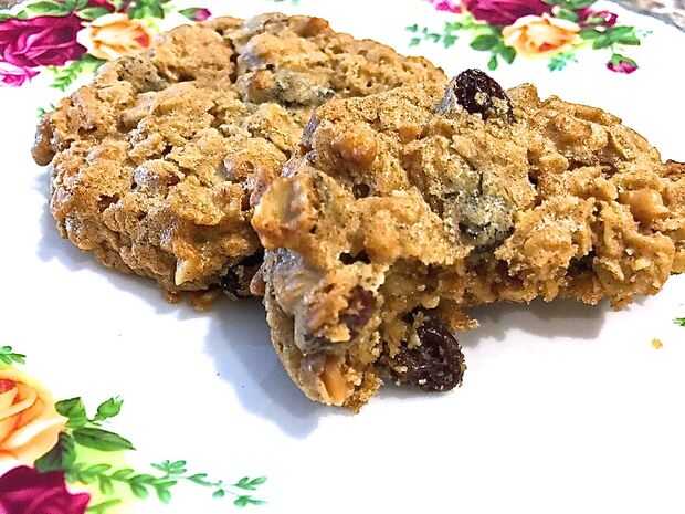 * Tamizar la harina, polvo de hornear, canela y la sal juntos en un tazón mediano. Con la batidora en baja, agregue lentamente los ingredientes secos a la mezcla de mantequilla. Agregar la avena, las pasas de uva y las nueces y mezclar sólo hasta combinar.