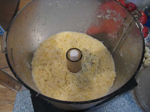 Mientras que usted puede comprar parmesano rallado ya, me gustaria usar los mejores ingredientes en mi pesto, así que a comprar buen parmesano y parrilla de mi. Colocar la hoja de la reja en el procesador de alimentos y moler el queso parmesano. La pieza en la foto es 1/2 libra - suficiente para los 2 lotes. Yo sólo la mitad había rallado. El queso rallado, retire del recipiente procesador (tendrás una copa de él) y reservar. Retirar la hoja de la reja del procesador y en la cuchilla de picar para prepararse para la albahaca.