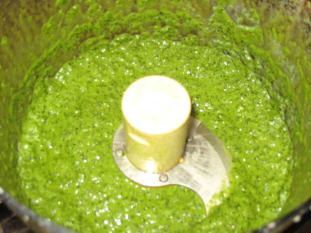 Encienda el procesador de alimentos y llovizna en la mantequilla y el aceite. Triturar la albahaca, el ajo y el perejil hasta que es totalmente liso y no trozos de albahaca siendo. Generalmente parar el procesador de alimentos 4 o 5 veces para raspar los lados con una espátula, luego moler algunos más. Moler hasta que se ve como el mio en la foto.