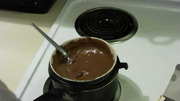 Ahora nos derrita el chocolate. En esta imagen, estoy utilizando el método del baño María. Esencialmente usted toma una olla poner un poco de agua en el fondo y calentar por lo que hierve. Usted tiene un tazón de fuente en la parte superior que se adapta a él, si el recipiente es un poco pequeño, use un colador para mantenerlo. El vapor se calienta el recipiente y derrite el chocolate muy bien. Asegúrese de revolver el chocolate.