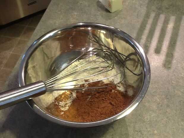 Wisk junto la harina, cacao en polvo, sal y bicarbonato de sodio. Cambialo a un lado por ahora.
