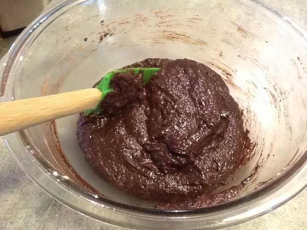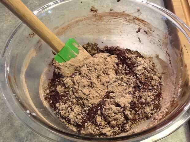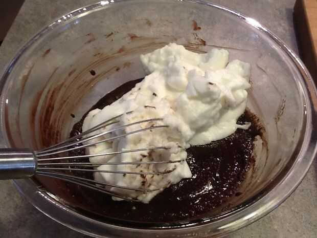 Añadir la mezcla de chocolate a las claras de huevo batidas, doblar suavemente. Añadir la mezcla de harina y doblar para combinar todos los ingredientes. No sobre mezclar esto, intentar mantenerlo ligero del huevo blancos, demasiado agitación pueden desinflar los blancos.