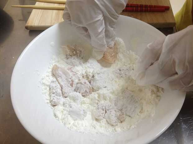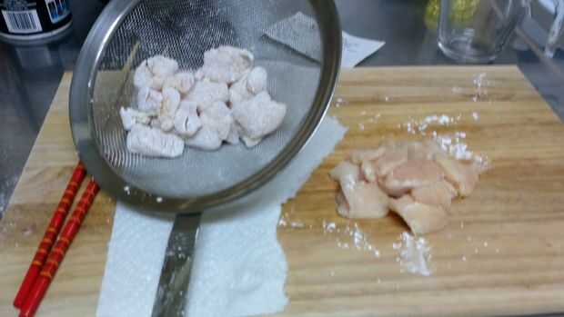 Cubrir los trozos de pollo en la fécula de maíz * hacer esto unos cuantos a la vez para que no se peguen juntos