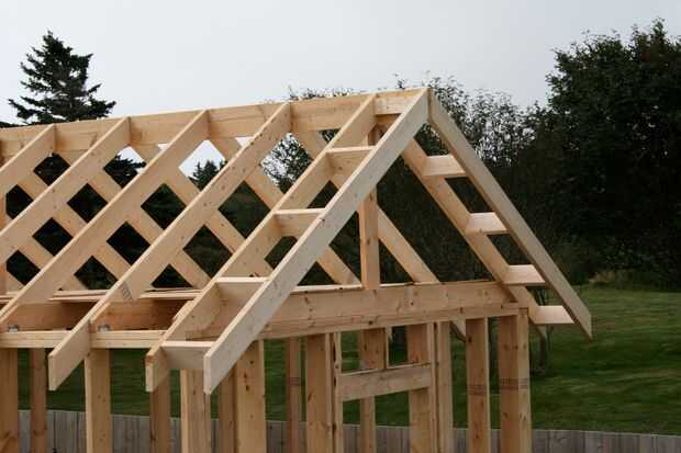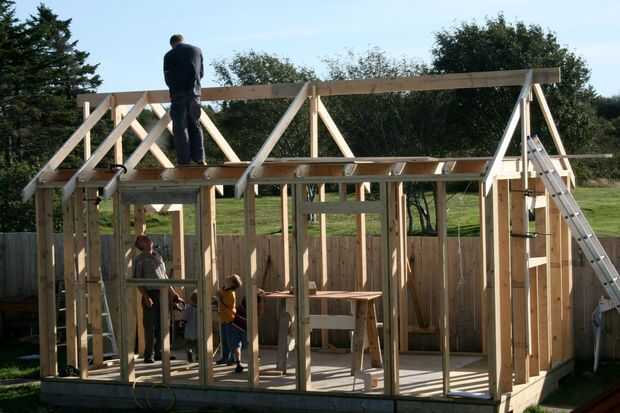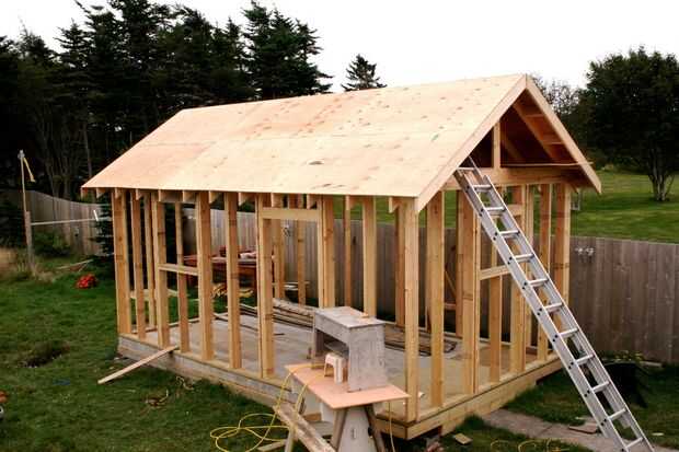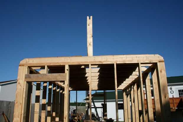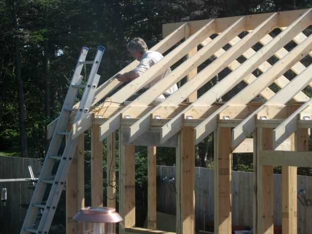 Algunas hojas de madera contrachapada de 1/2 pulgada que puso temporalmente en las vigas del techo le dio una buena plataforma de trabajo para ayudar con la instalación de la cumbrera, vigas y finalmente, el revestimiento del techo.