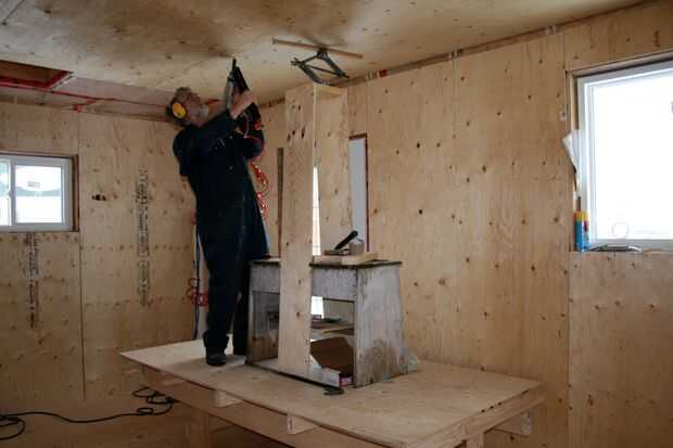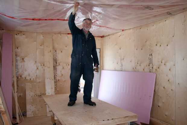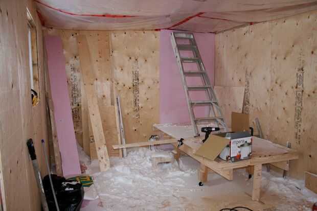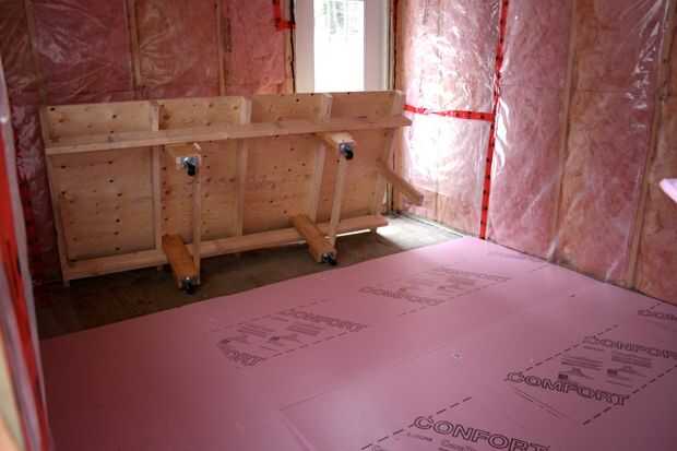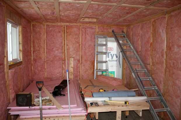 Aislamiento de fibra de vidrio en el techo y las paredes y el aislamiento de espuma sólida en el suelo se combinan para hacer un fácil al calor y vertiente cómoda instalación. Puse la espuma sólida de placas de aislamiento sobre la cubierta de piso de madera contrachapada tratada a presión. Remata con madera contrachapada de grado exterior de 1/2 pulgada. Instalé la misma madera en las paredes y el techo porque quería clavo, tornillo o unidad de lo que yo quería, sin tener que preocuparse de no tener una superficie sólida para trabajar con. He instalado la barrera de vapor de plástico entre el aislamiento y el revestimiento en ambos las paredes y techo.