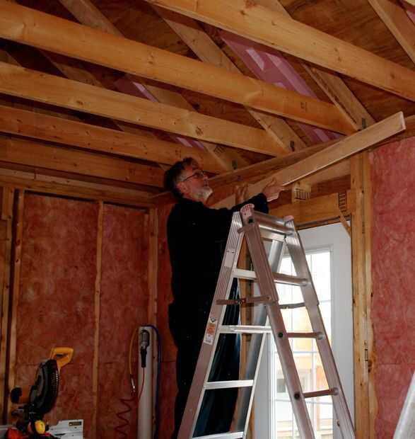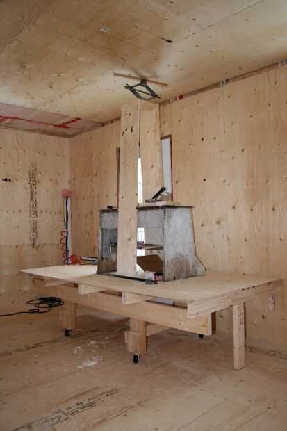 Hice una plataforma de trabajo con ruedas patas cuatro que me ayude a instalar las láminas de madera contrachapada para el techo. Un sencillo sistema de soportes de madera y un gato del coche montado sobre la plataforma que sostuvo firmemente las hojas mientras que clavó en el lugar.