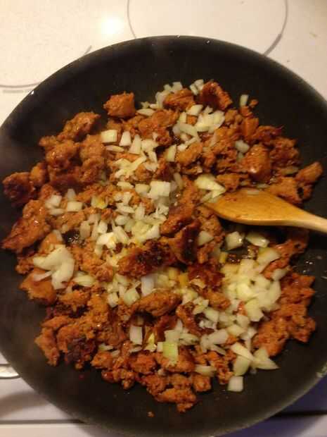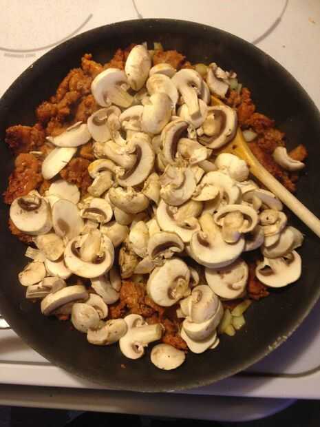 Agregue la cebolla y setas. Saltear hasta que las cebollas estén transparentes y los champiñones estén dorados.