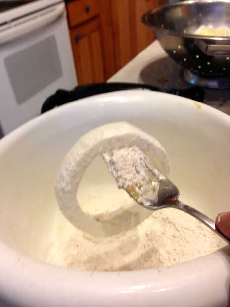 Coloque un aro de cebolla en la harina sazonada. Dar una buena sacudida en la flor para cubrir la cebolla con la mezcla sazonada de la flor. Golpear cualquier grumos grandes de harina del anillo de la cebolla.