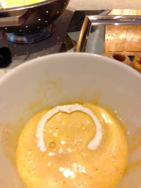 Preparar el baño de huevo poniendo los huevos, así como una buena cantidad de la salsa de Worcestershire y Sriracha en una licuadora y licue a alta durante 2 minutos. Con la licuadora funcionando, rocíe en el aceite de su elección y deje que se mezclan con los huevos y salsas para un minuto adicional. La mezcla de huevo le ayudará el empanado se adhieren a la cebolla, pero también promoverá el dorado. Transferir la mezcla de huevo en un recipiente lo suficientemente profundo como para mojar la cebolla.
