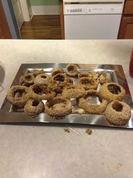 Agitar la cebolla con la mezcla de huevo en él de las migas sazonadas hasta que consigue cubierta con la mezcla de la miga. Capa hasta que consigue cubierto tan totalmente como sea posible.