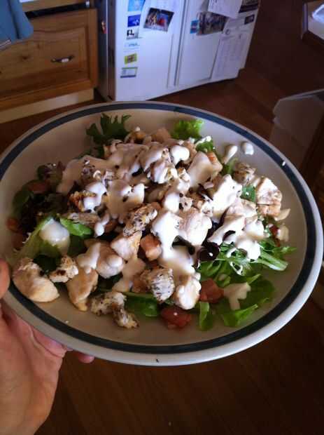 ensalada de pollo y César todo en unoPaso 1: ingredientes -Pollo rebanado (empapado en salsa italiana y a la parrilla)-Tomates picados-Lechuga picada-Cebolla picada-Tiras de queso cheddar (o cualquier tipo de queso)-Aderezo de Caesar (usé Steak House